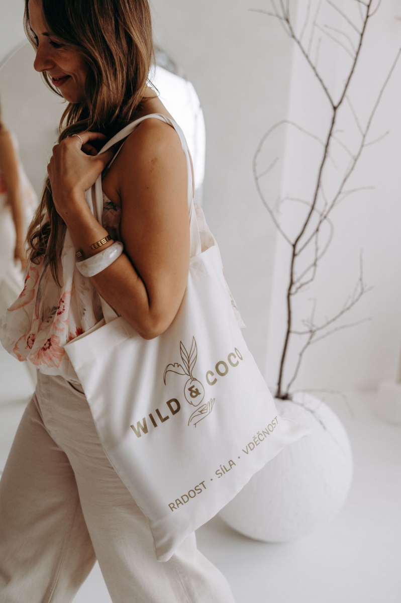 Je vyrobena z BIO bavlny a potištěná klíčovými slovy naší společnosti: RADOST, SÍLA, VDĚČNOST.