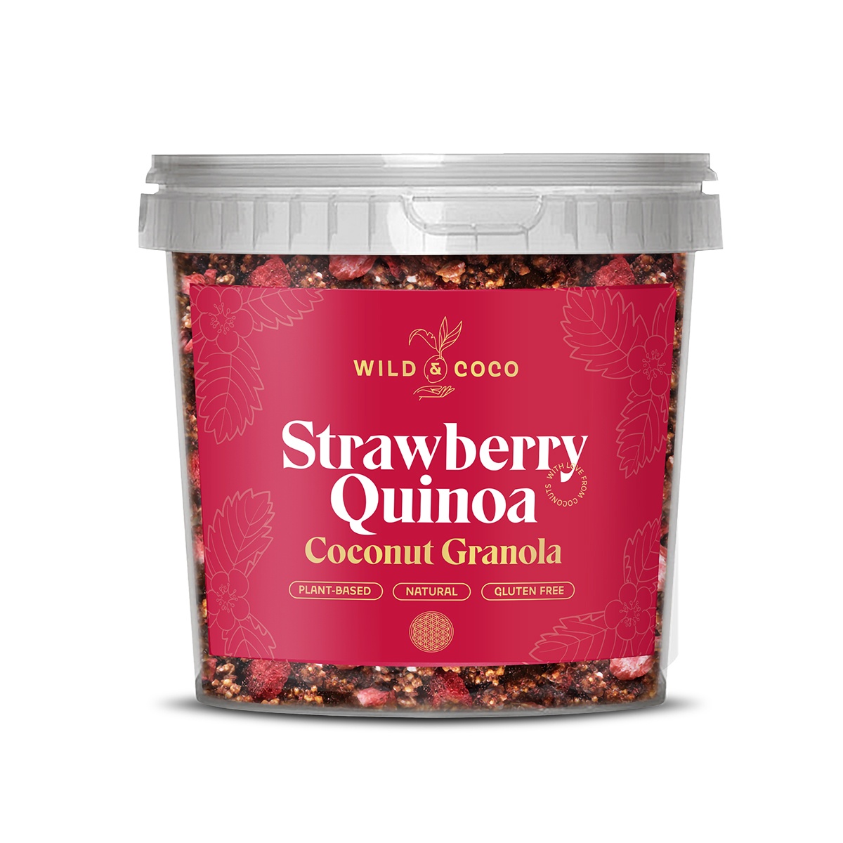 Křupavá granola s lyofilizovanými jahodami je bezlepková veganská pochoutka pro všechny, kdo rádi snídají či mlsají zdravě. Je totiž plná semínek, pufované quinoy a samozřejmě kokosových chipsů. Agáve sirup a rozemletá lněná semínka drží vše pevně pohromadě, takže ji klidně můžete vzít s sebou na výlet či do práce a ujídat jen tak. Výborně se hodí taky na snídani ke cocoguardu.