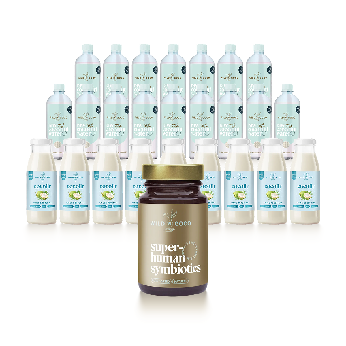 Uvnitř najdete: 16× Royal Virgin kokosová voda, 9× Biotic kefír a Superhuman Symbiotics (10 kapslí). Pro týdny, kdy se chcete opřít o jasnou strukturu a nepřidávat si rozhodování navíc.