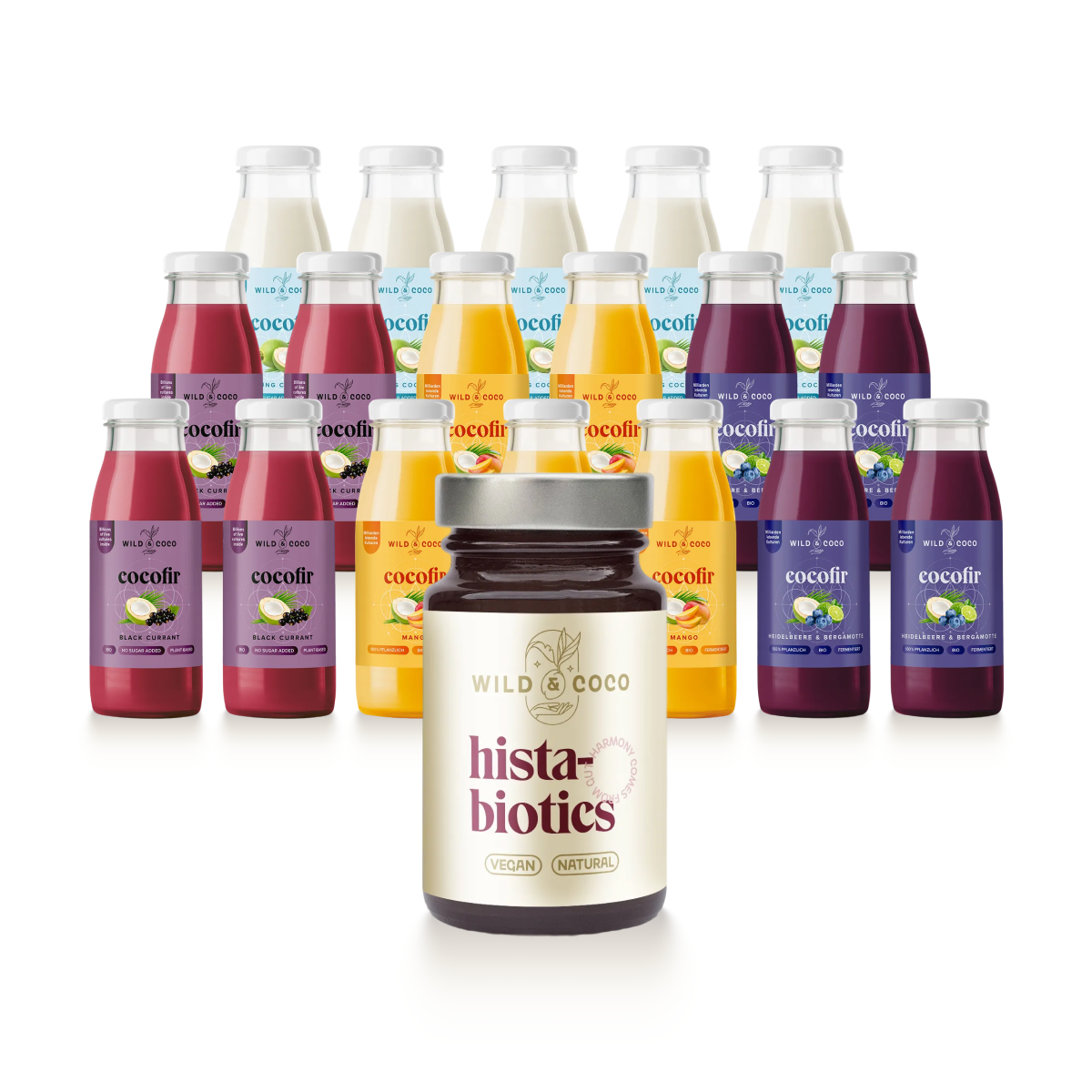 In dem Paket finden Sie die Verbindung zweier Dinge, die sich wunderbar ergänzen: gezielte probiotische Unterstützung (HistaBiotics 1.0) und fermentierten Cocofir – ein leichter Kokoskefir voller lebender Kulturen. Es ist, als würde man in sich selbst Raum schaffen: damit die Verdauung wieder atmen kann, der Bauch sich beruhigt und Sie mehr Leichtigkeit und Energie im Alltag haben.